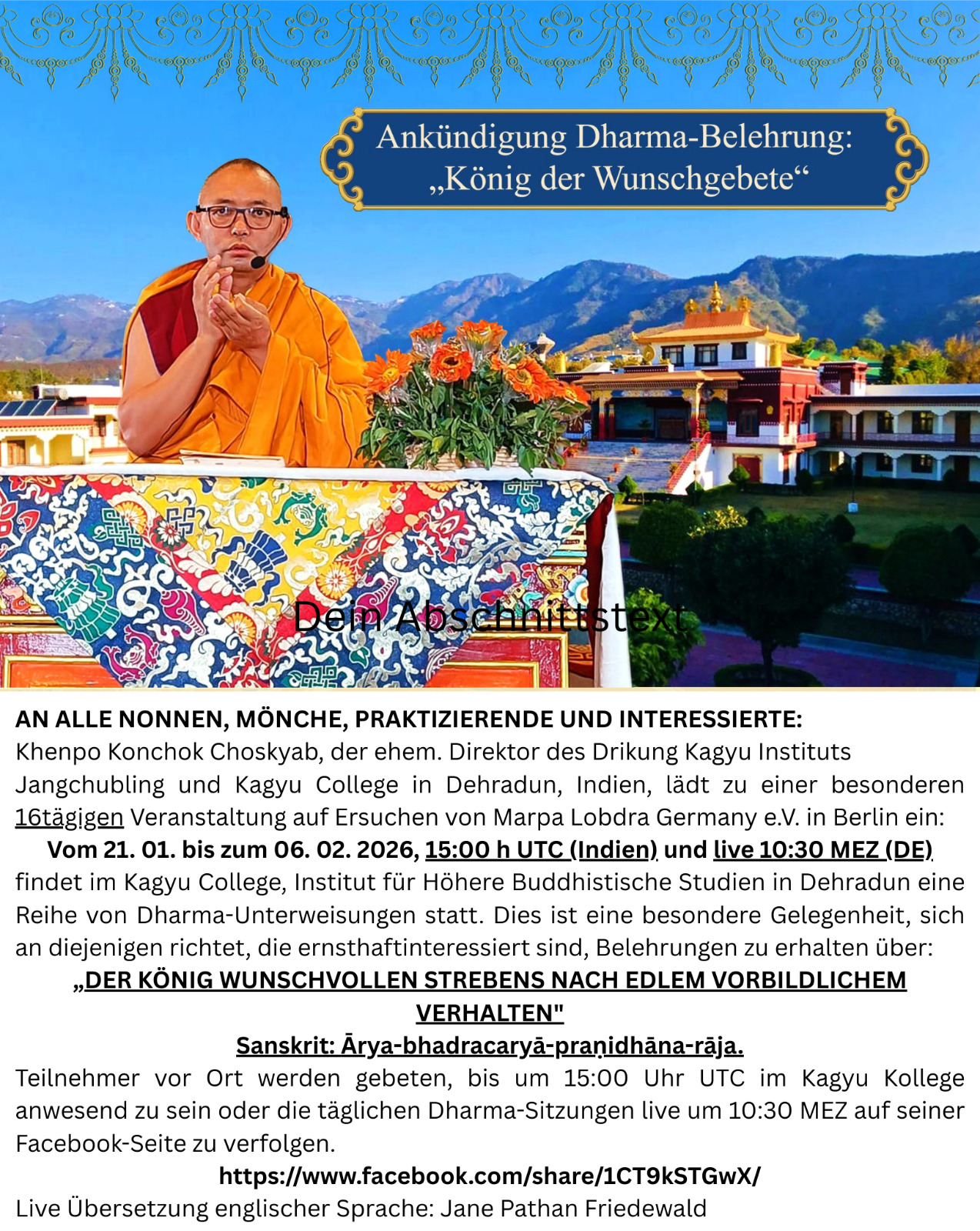 ![]() „Das Wachrufen und Entwickeln der eigenen Spiritualität als Pfad zu Heilung und Gesundheit“ 03.10.2025 | 19h30 - 21h 04.10.2025 | 11 - 13h & 15 - 18h30 05.10.2025 | 11 - 13h & 15 - 18h30 Bodhicharya Deutschland e.V. Kinzigstraße 25 10247 Berlin Präsenzveranstaltung mit Zoom Live Übertragung